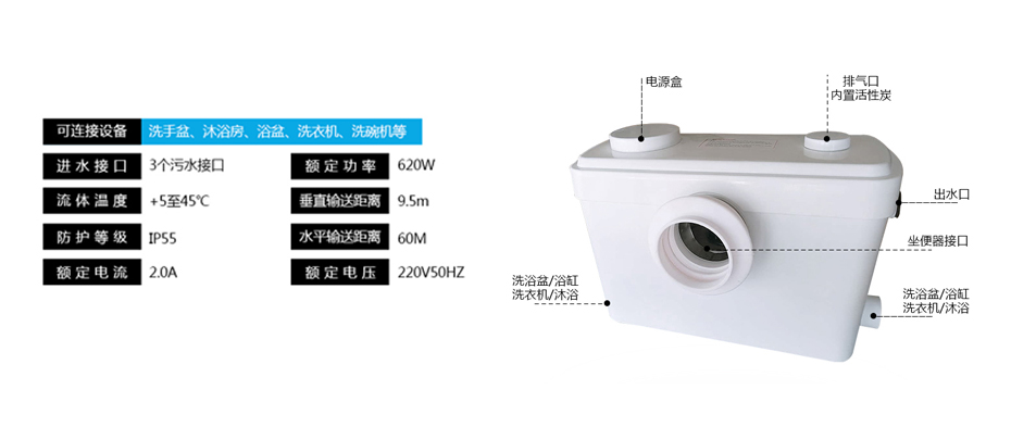 可連接設備:洗手盆、沐浴房、浴盆、洗衣機、洗碗機等。